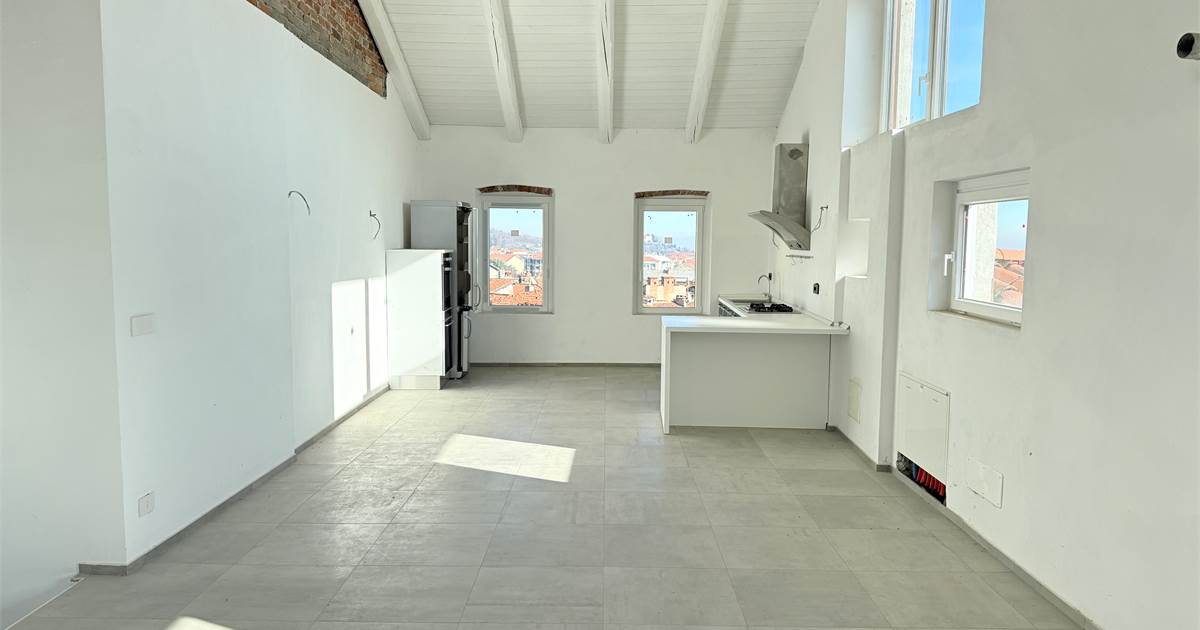 Il cuore pulsante della casa si trova però al secondo e ultimo piano, dove si apre un’ampia zona giorno open-space di circa 50 mq, con soffitto a tutta altezza impreziosito da travi in legno a vista e grandi finestre panoramiche che offrono una splendida vista sui tetti e sul centro storico di Pinerolo. La parete cucina, già predisposta con impianti e attacchi, è lineare e funzionale, mentre la generosa metratura del piano consente di ricavare, volendo, un secondo bagno.